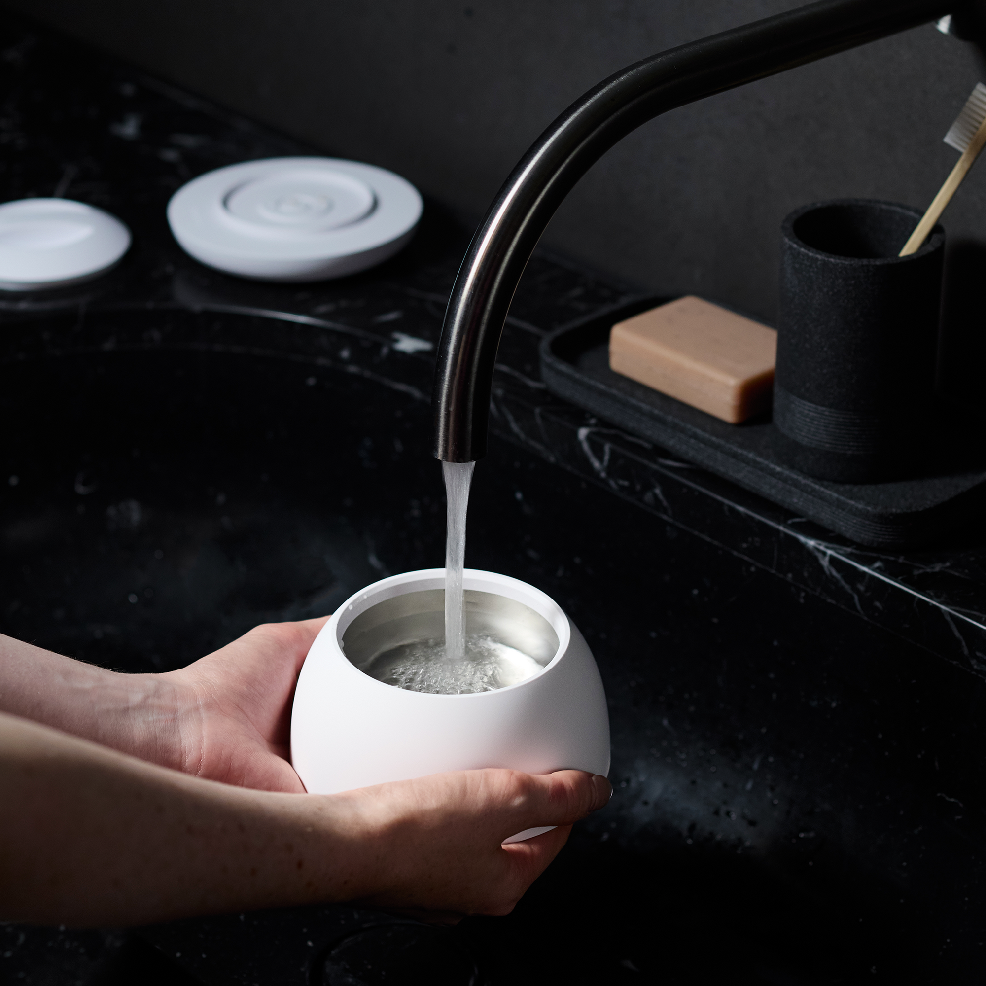 Tank und Basis sind separate, abnehmbare Komponenten. So kannst du den Tank ganz einfach befüllen, entleeren und reinigen, ohne das Gerät vom Strom trennen zu müssen. Hebe den Tank einfach ab und halte ihn unter den Wasserhahn. Der Stromanschluss in der Basis bleibt dabei sicher von der Wasserquelle entfernt.